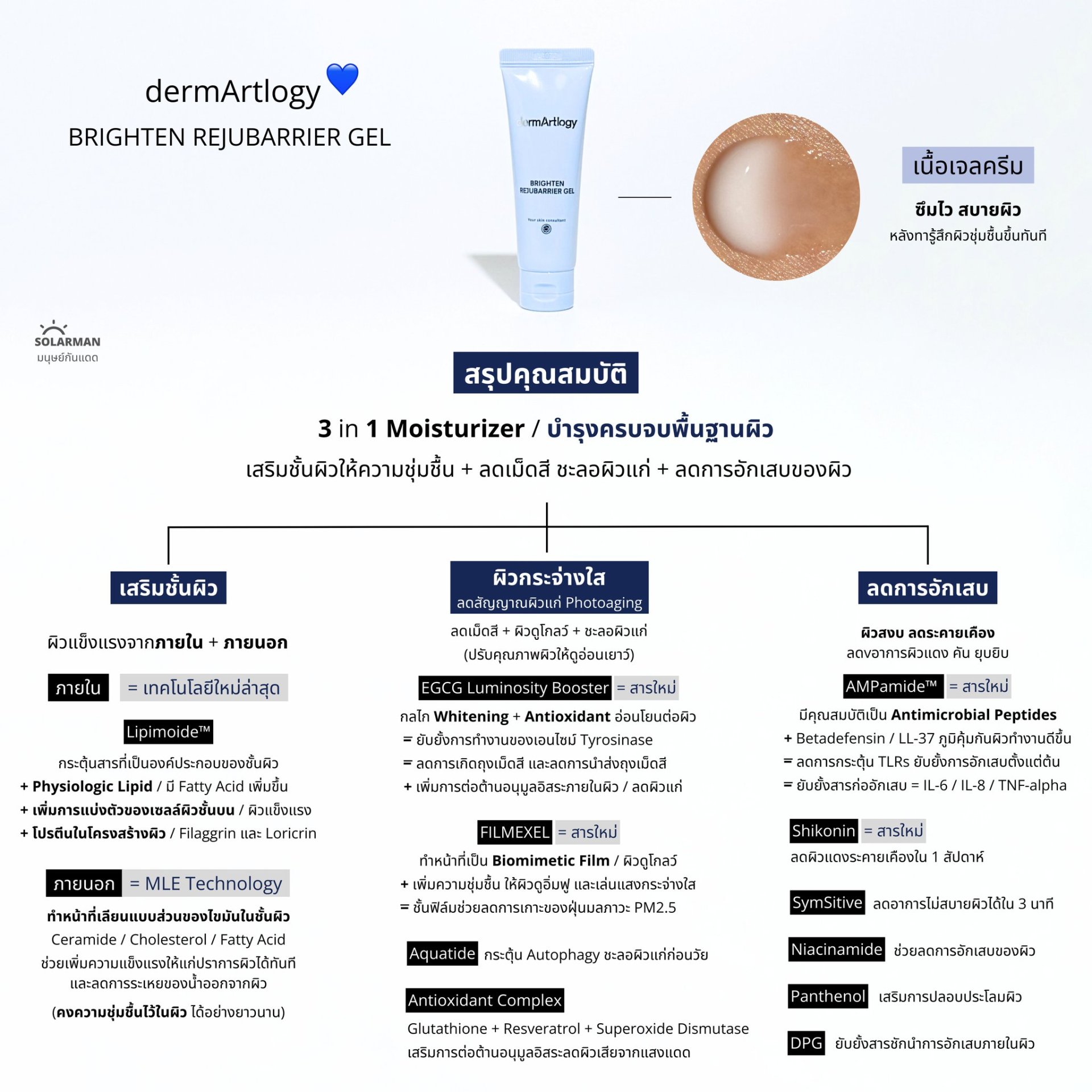 เป็นมอยซ์เจอร์ไรเซอร์เนื้อเจลที่ทาง่ายเหมือนเดิม (สูตรเดิมเนื้อจะแตกตัวเป็นน้ำมากกว่า) / หลังใช้รู้สึกสบายผิว อาการยุบยิบผิวดูสงบขึ้นทันที ... ในส่วนของการทากันแดดต่อ เท่าที่กอล์ฟลองมาในช่วงสัปดาห์นี้ไม่เกิดขุยเลยครับ / เพื่อน ๆ ที่กำลังหามอยซ์บำรุงผิวแบบครบเครื่อง dermArtlogy Brighten Rejubarrier Gel = เหมาะมากครับ ... ปล. ผ่านการทดสอบการระคายเคือง ไม่ก่อการอุดตันผิว ไม่มีแอลกอฮอล์และน้ำหอม